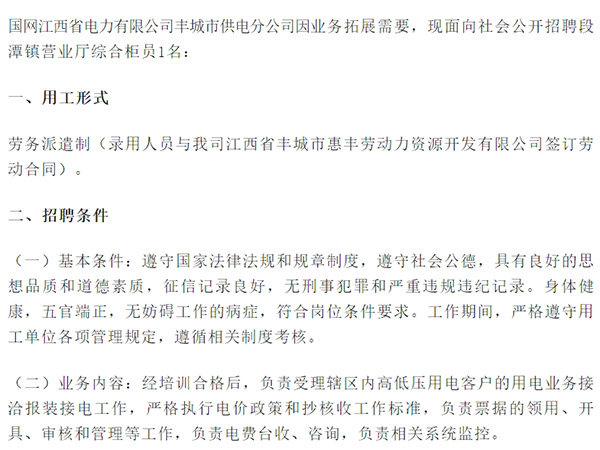 國網(wǎng)江西省電力有限公司豐城市供電分公司因業(yè)務拓展需要,現(xiàn)面向社會公開招聘段潭鎮(zhèn)營業(yè)廳綜合柜員1名:一、用工形式勞務派遣制(錄用人員與我司江西省豐城市惠豐勞動力資源開發(fā)有限公司簽訂勞動合同)。二、招聘條件(一)基本條件:遵守國家法律法規(guī)和規(guī)章制度,遵守社會公德,...